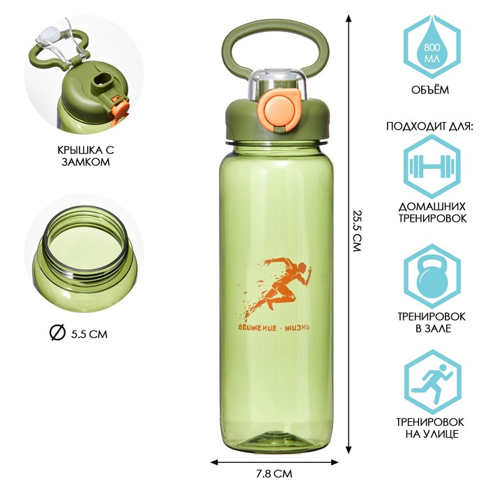 Бутылка для воды, 800 мл, "Движение - жизнь", с поильником, зеленая
