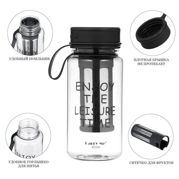 Бутылка для воды, 400 мл, с ситечком, 17.5×10.5 см, черная