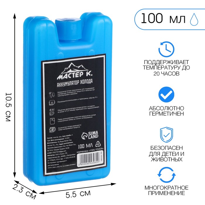 Аккумулятор холода гелевый «Мастер К», 100 мл, хладоэлемент для термосумок, 10.5×5.5×2.3 см 4043