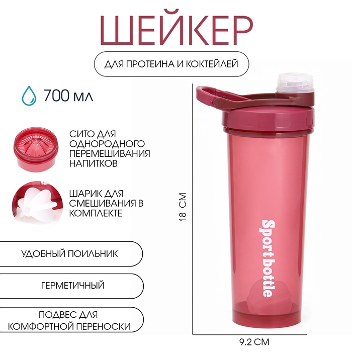 Шейкер спортивный для коктейлей, спортивного питания, 700 мл, PowerPlus, 18х9.2 см, красный
