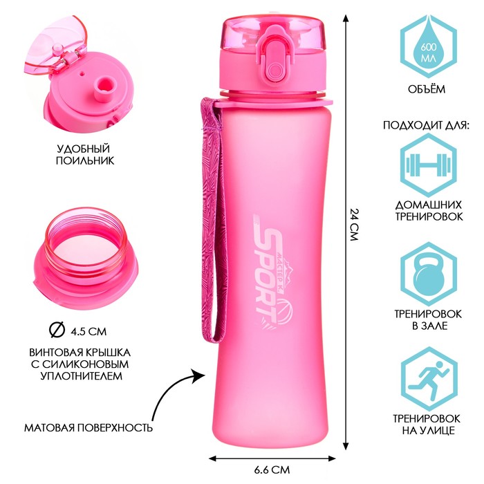 Бутылка для воды, 600 мл, SPORT, 600 мл, с поильником, розовая