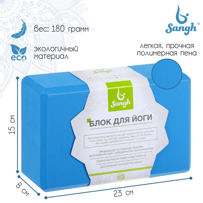 Блок для йоги Sangh, 23х15х8 см, цвет синий