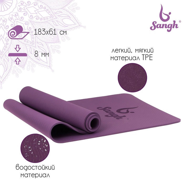 Коврик для йоги Sangh, нескользящий, 183×61×0.8 см, цвет фиолетовый