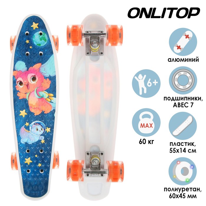 Пенниборд ONLITOP, 55х14 см, колёса световые PU 60х45 мм, ABEC 7, алюминиевая рама