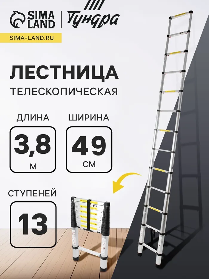 Лестница телескопическая в сумке ТУНДРА, алюминиевая, 13 ступеней, автомат, 3.8 м