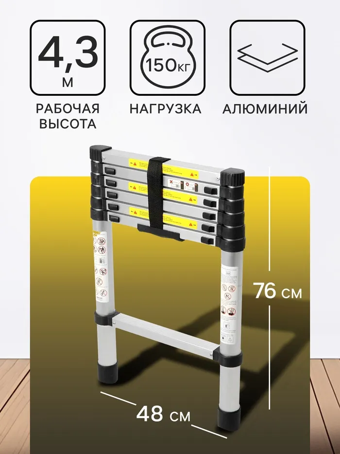 Стремянка-лестница телескопическая ТУНДРА, раскладная, алюминиевая, 2.2×2.2 м