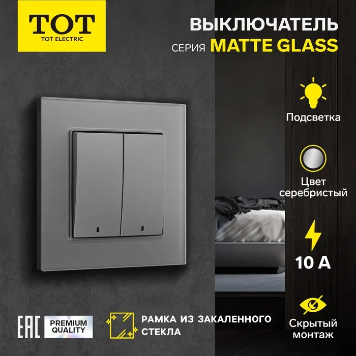 Выключатель TOT Matte Glass, 10 А, 2 кл., с подсветкой, скрытый, стекло, серебристый