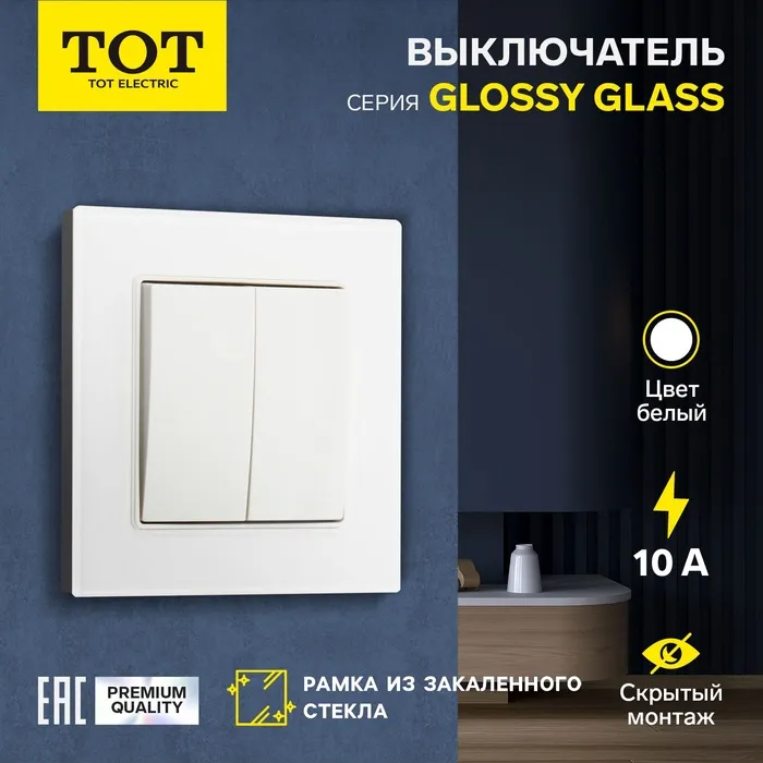 Выключатель проходной TOT Glossy Glass, 10 А, 2 клавиши, скрытый, стекло, белый