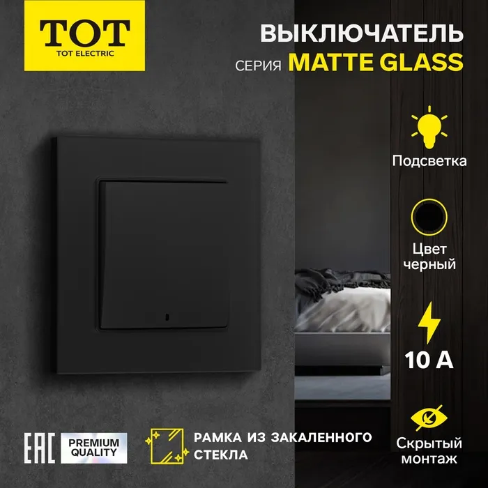 Выключатель TOT Matte Glass, 10 А, 1 кл., скрытый, стекло, черный