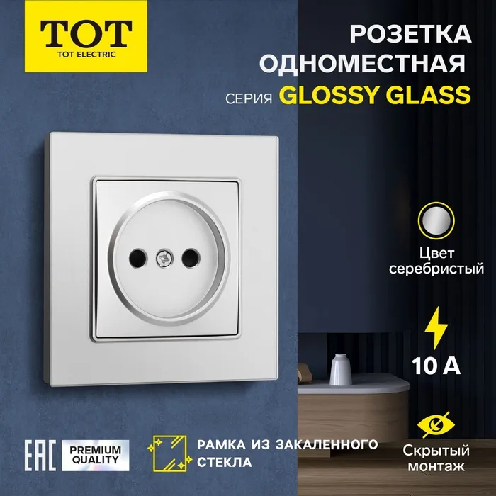 Розетка одноместная TOT Glossy Glass, 10 А, скрытая, без з/к, стекло, серебристая