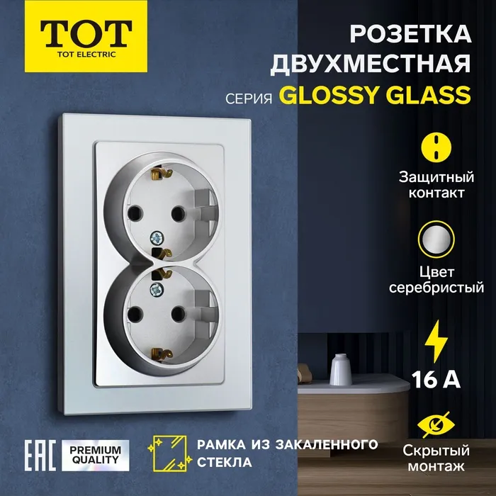 Розетка двухместная TOT Glossy Glass, 16 А, скрытая, с з/к, стекло, серебристая
