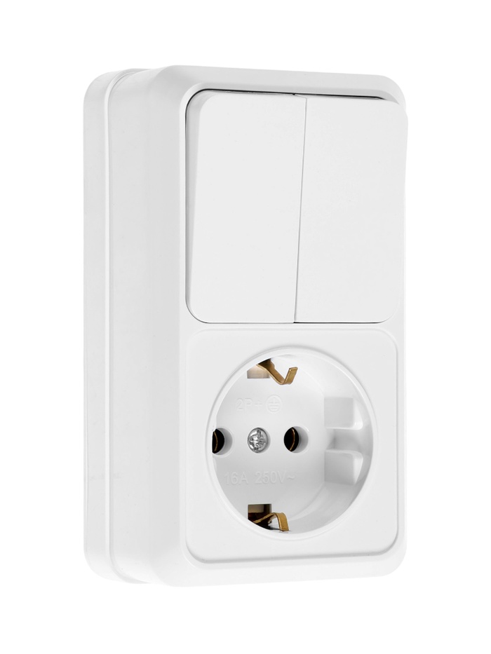 Выключатель двухклавишный с розеткой TANGO, 16 А, IP20, вертикальный, с заземлением, белый