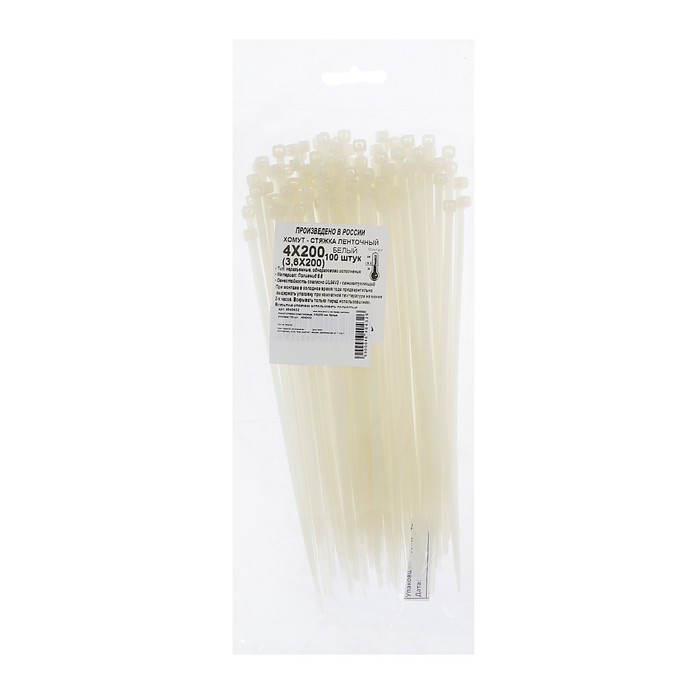 Хомут-стяжки пластиковые, 3.6×200 мм, белые, упаковка 100 шт.