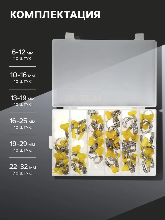 Набор червячных хомутов с «барашком» ZEIN engr, сквозная просечка, от 6 до 32 мм, 60 шт.