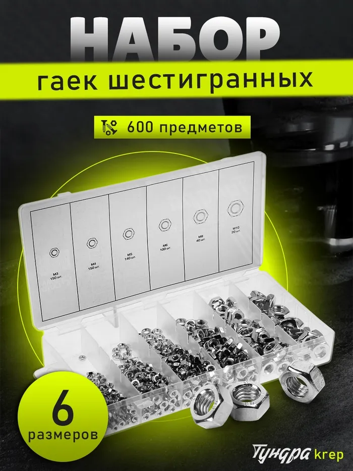 Набор гаек шестигранных ТУНДРА krep, 600 предметов