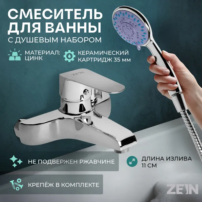 Смеситель для ванны ZEIN Z3854, однорычажный, душевой набор, лейка 5 режимов, хром