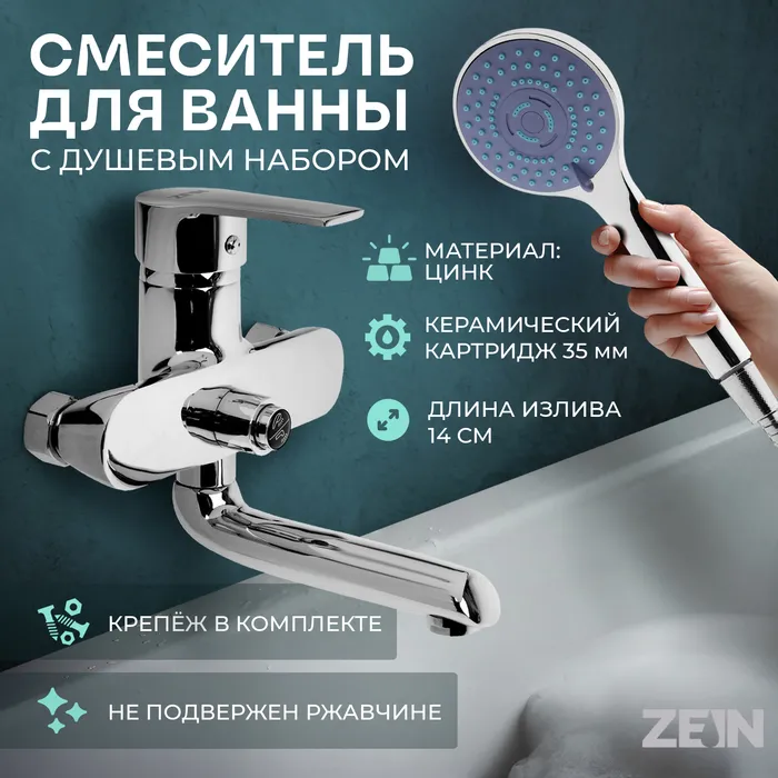 Смеситель для ванны ZEIN Z3846, однорычажный, душевой набор, лейка 5 режимов, хром
