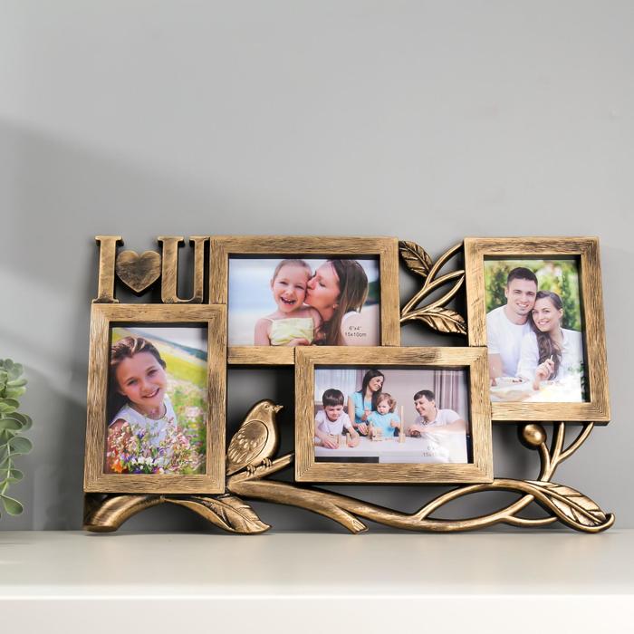 Фоторамка-коллаж на 4 фото 10×15 см «Птица на ветке», пластик, мультирамка, т. золото, 28×47 см