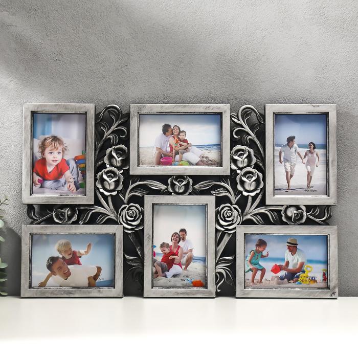 Фоторамка-коллаж на 6 фото 10×15 см «Куст роз», т. серебро, 35.5×56.5×2 см