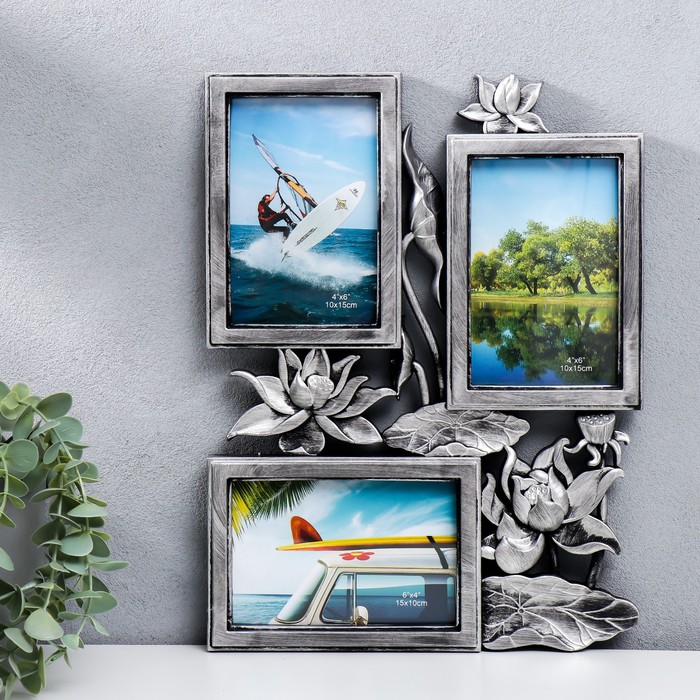 Фоторамка-коллаж на 3 фото 10×15 см «Лотосы», т. Серебро, 36×27 см