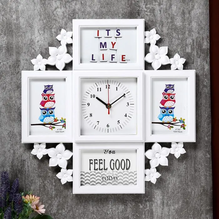 Фоторамка пластик на 4 фото 10х15 см с часами "Цветочки" белая 42х42 см