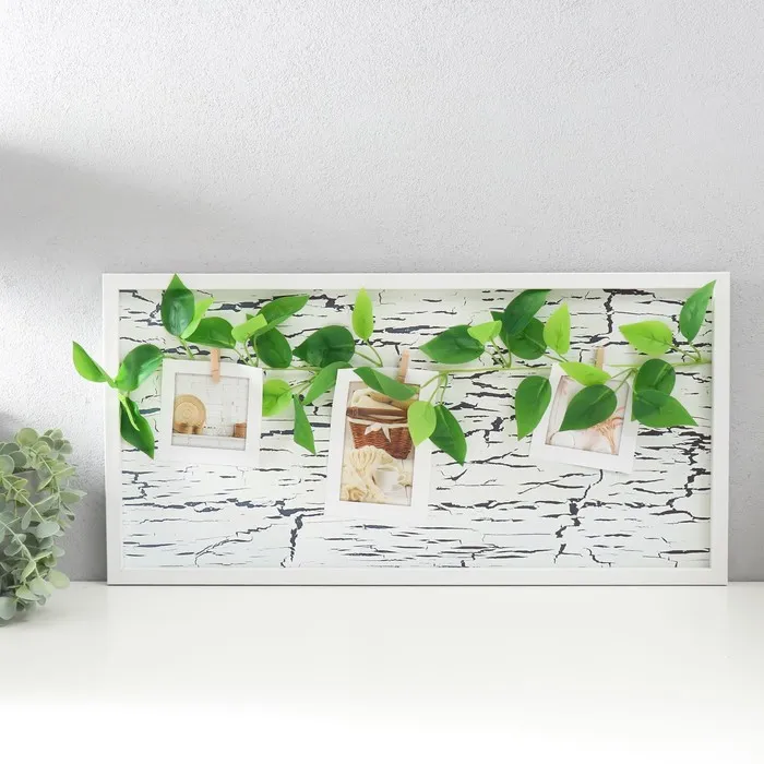 Фоторамка пластик на 3 фото "Кракелюр с листьями" с прищепками, белый 60х30 см