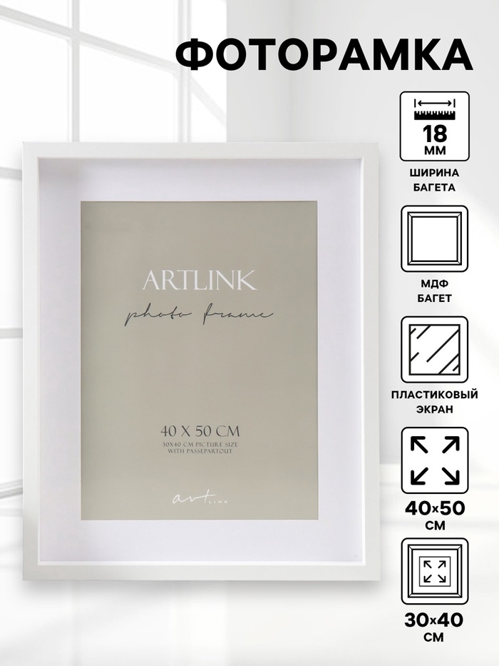 Фоторамка для фото 40×50 см, с паспарту 30×40 см Valerie, МДФ, белый, (пластиковый экран)