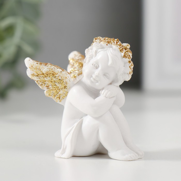 Сувенир полистоун "Ангелочек с головой на коленках сидит" белый с золотом 4,5х3,2х4,5 см