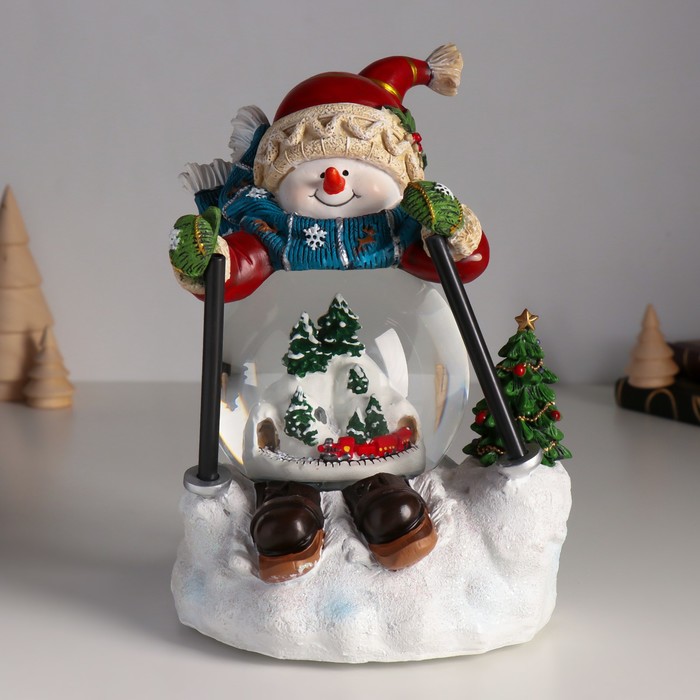 Снежный шар новогодний стеклянный «Снеговичок на лыжа×», музыкальный, световой, d=10 см, 15×13.5×21 см