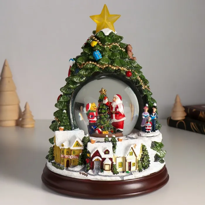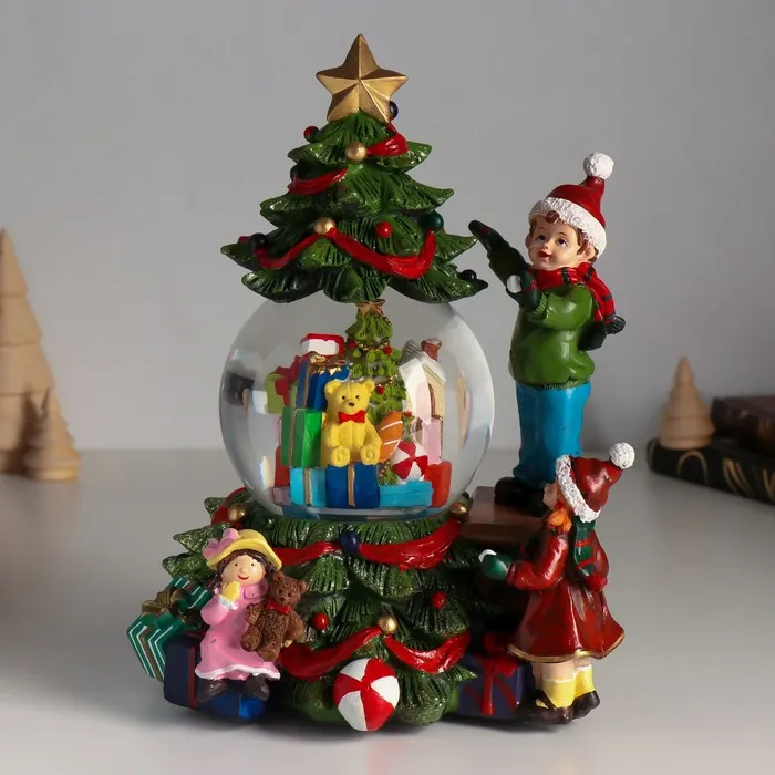 Снежный шар новогодний стеклянный «Мальчик наряжает ёлку», музыкальный, световой, d=10 см, 18×16×23 см