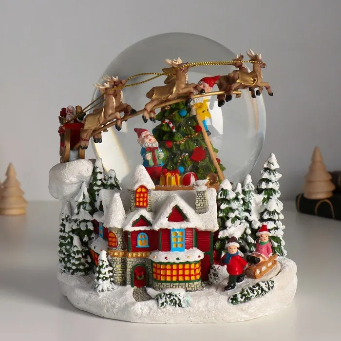 Снежный шар новогодний стеклянный «Сани Деда Мороза», музыкальный, световой, d=12 см, 17×16.5×17.5 см
