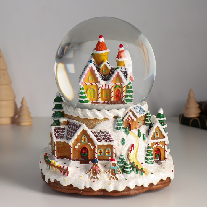 Снежный шар новогодний стеклянный «Пряничный город», музыкальный, световой, d=12 см, 16.5×16.5×19.5 см