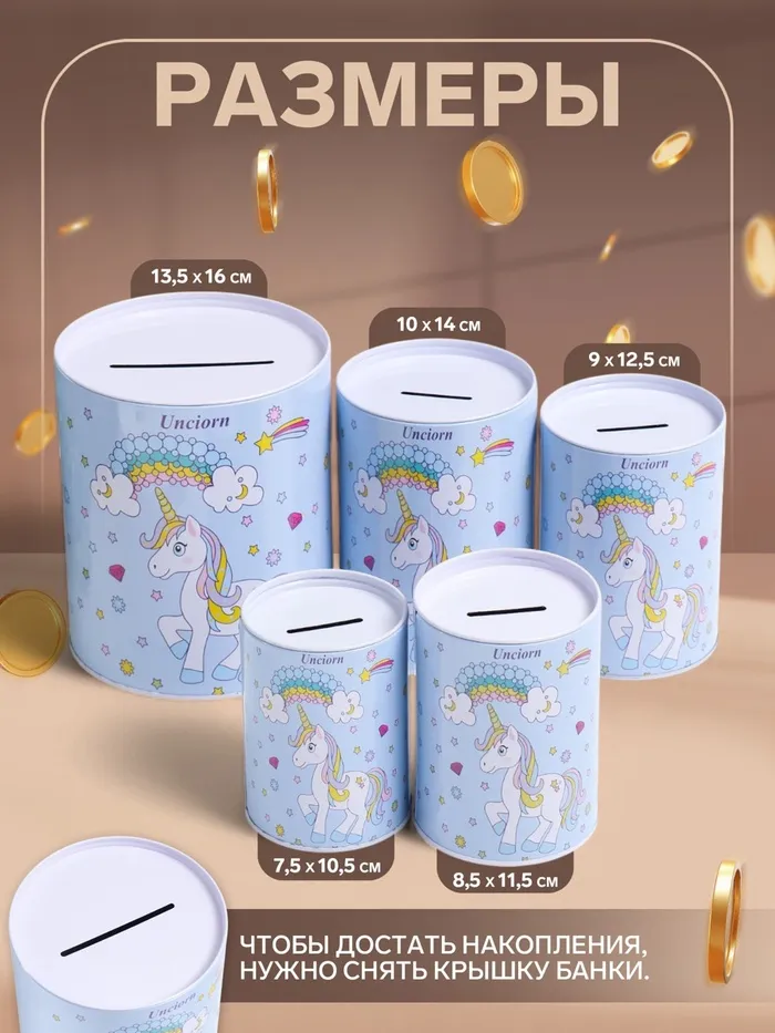 Копилка для денег «Банка. Единорог и радуга» набор 5 шт., металл, 7.5×10.5 см; 8.5×11.5 см; 9×12.5 см; 10×14 см; 13.5×16 см
