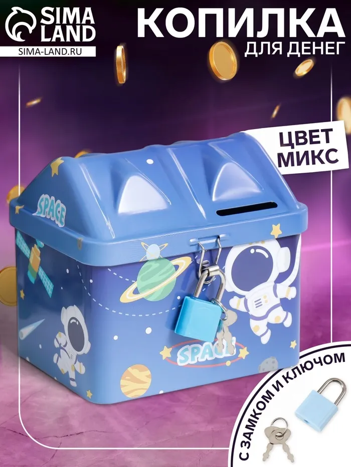 Копилка для денег с замком и ключом «Космические приключения», металл, 12×9.5×10 см, МИКС
