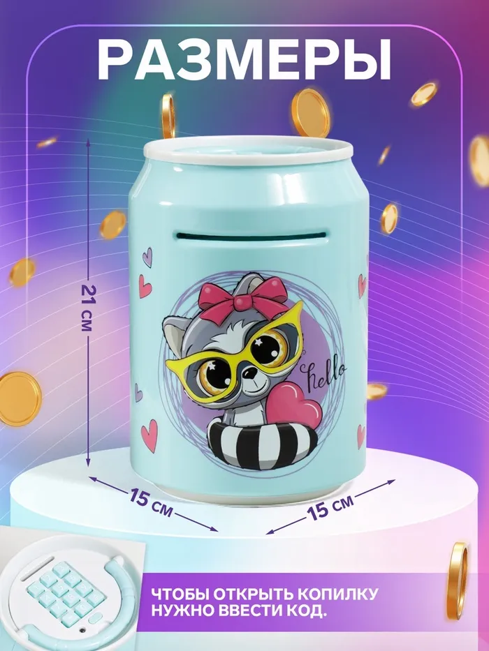 Копилка для денег «Банка. Енотик», пластик, кодовый замок, звук, 3×АА, голубой, 15×21 см