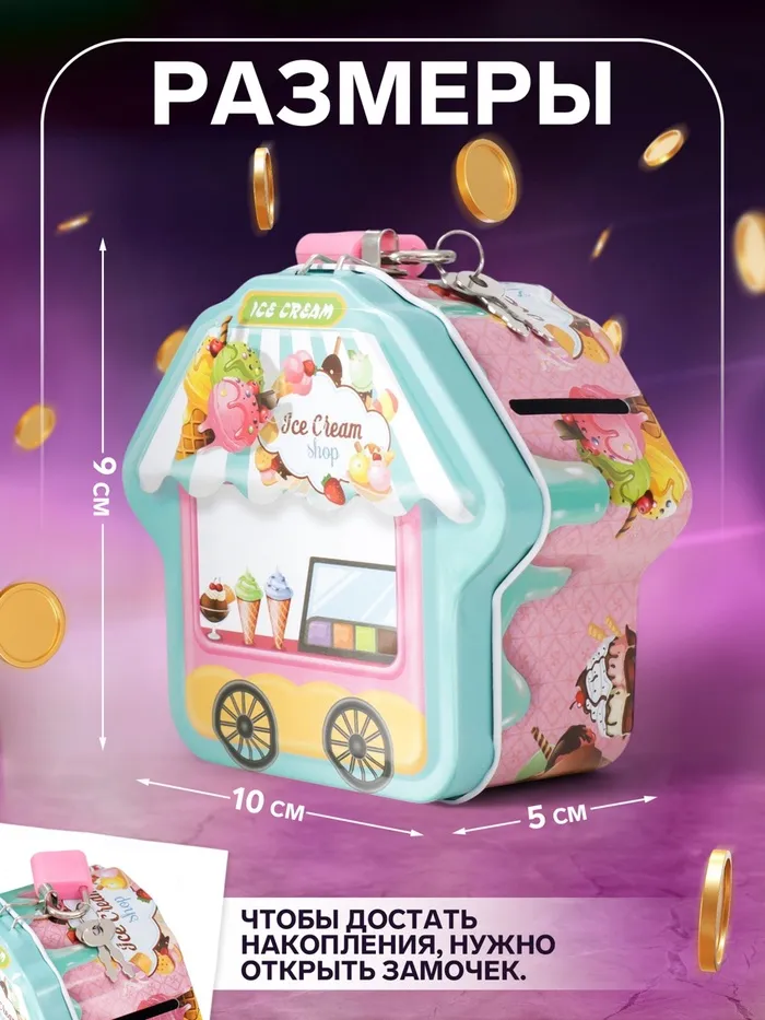Копилка для денег с замком и ключом «Киоск с мороженым», металл, 9×10×5 см, МИКС