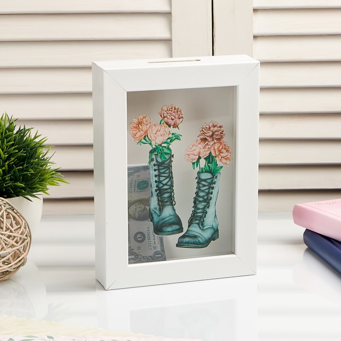 Интерьерная копилка для купюр и монет «Пионы в ботинках», пластик, 17×12×3.8 см