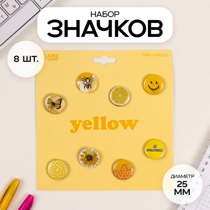 Значки закатные набор 8 шт d=25 мм "Жёлтые" 16,5х17 см