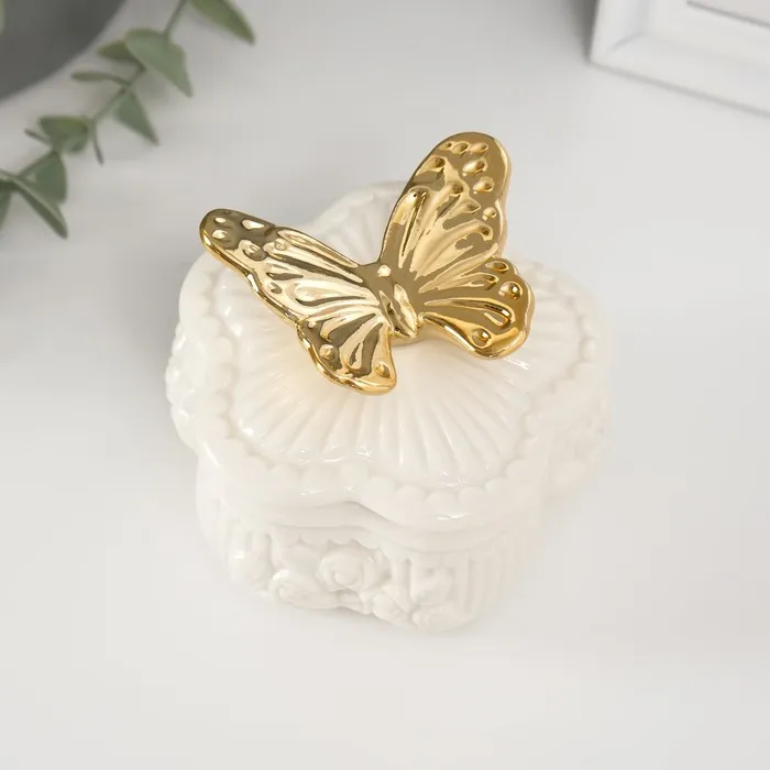 Шкатулка для украшений «Бабочка на цветке прованс», керамика, белая, 8.5×8.5×8 см