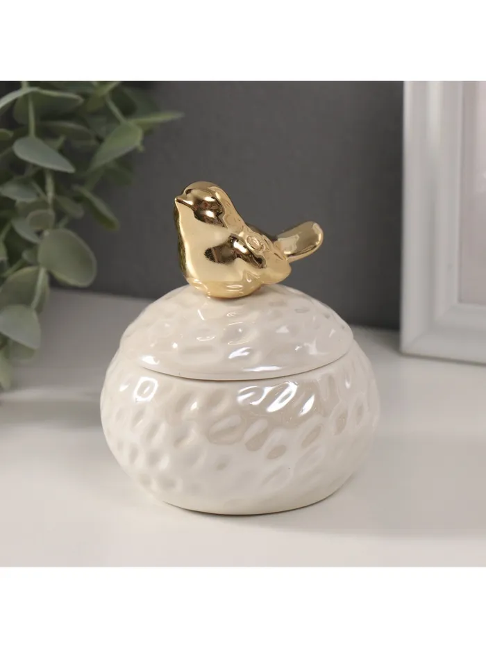 Шкатулка для украшений «Золотая птичка на гнезде», керамика, белый перламутр, 8.5×8.5×10 см