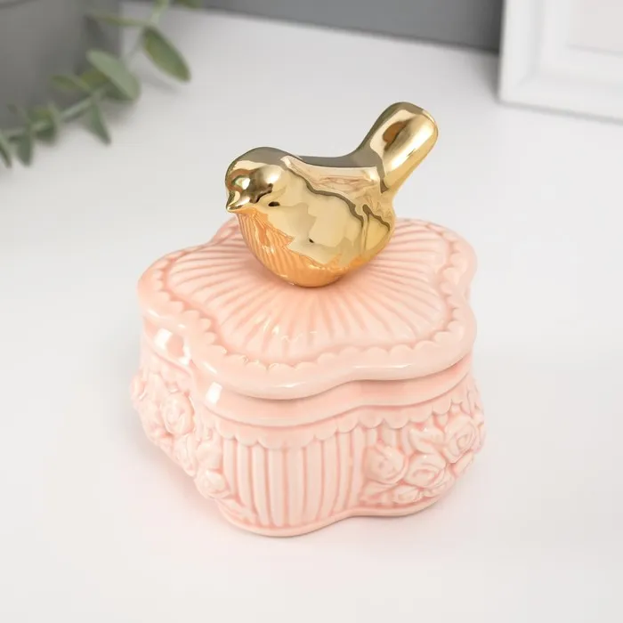 Шкатулка для украшений «Птичка на цветке прованс», керамика, розовая, 8.5×8.5×9.2 см