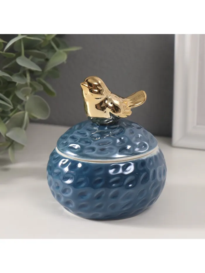 Шкатулка для украшений «Золотая птичка на гнезде», керамика, синий перламутр, 8.5×8.5×10 см