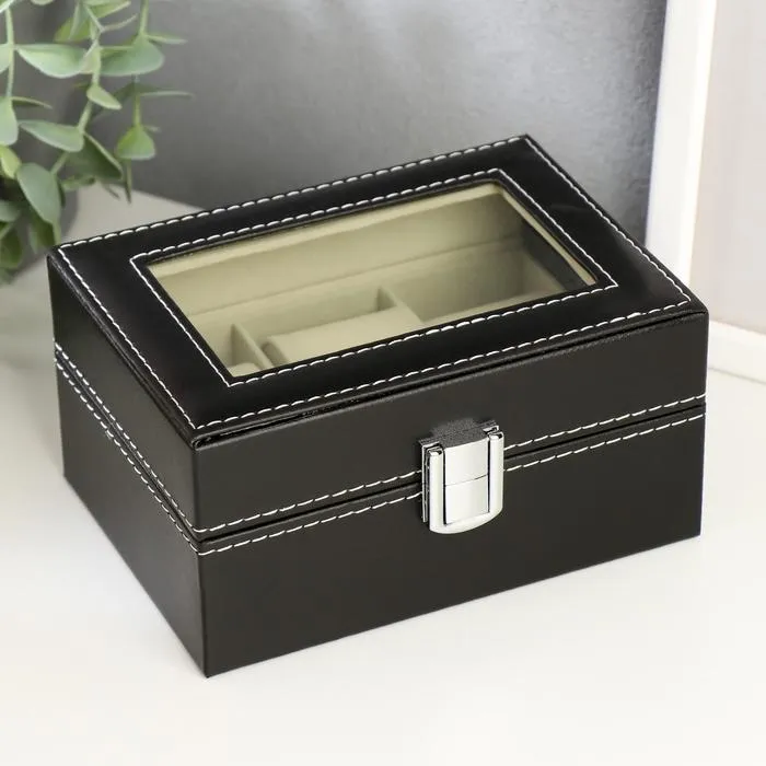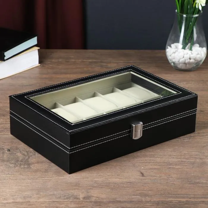 Шкатулка для часов 12 отделений «Чёрная с белой строчкой», с замком, искусственная кожа, 30×20×8.2 см