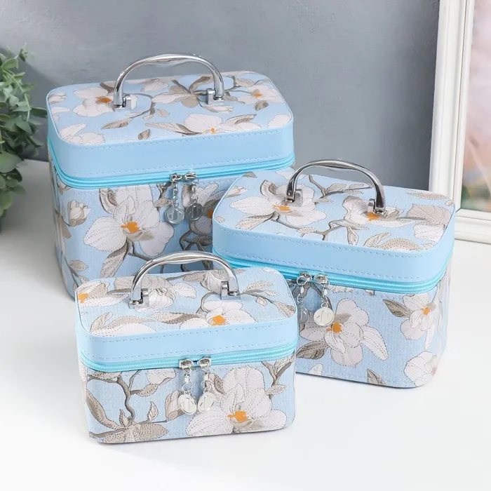 Набор шкатулок для украшений с зеркалом «Цветы. Голубой», 3 шт., искусственная кожа