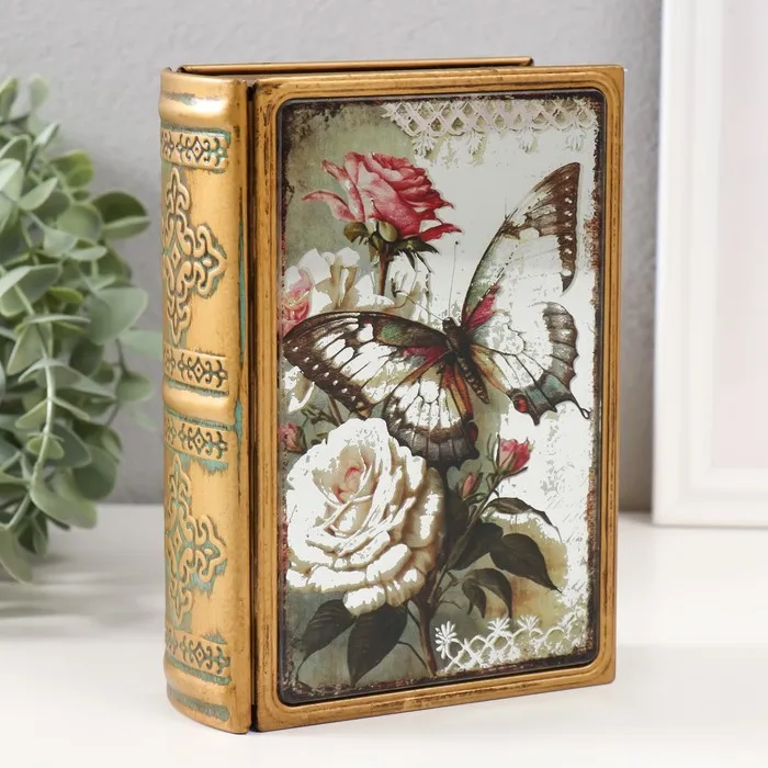 Шкатулка-книга «Бабочка и розы», металл, искусственная кожа, с зеркалом, 17×12×5 см