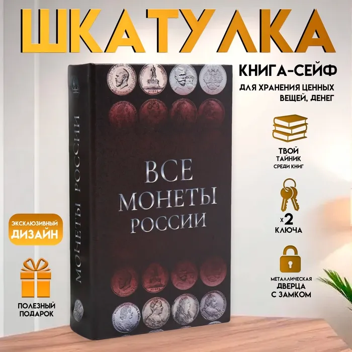 Шкатулка книга-сейф «Монеты России», дерево и искусственная кожа, с замком, 21×13×5 см