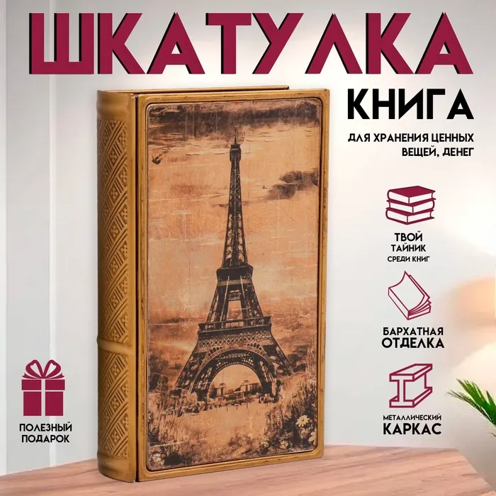 Шкатулка-книга «Эйфелева башня. Красивый закат», металл и искусственная кожа, 26×16×5 см