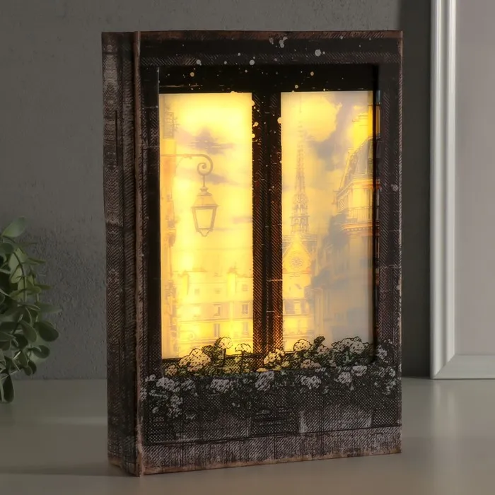 Шкатулка-книга световая «Вид на город из окна», дерево, искусственная кожа, 28×19×6 см