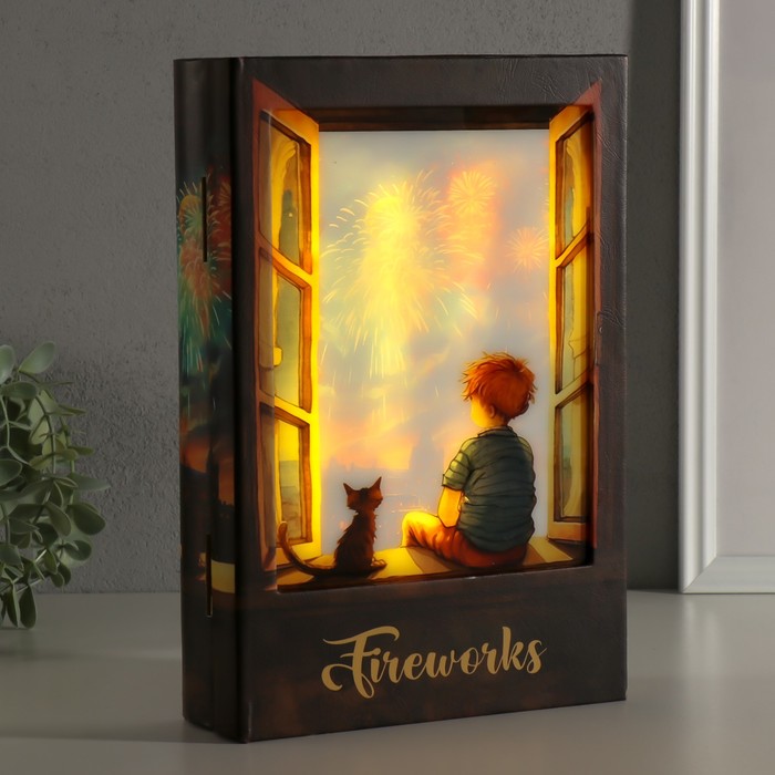 Шкатулка книга-сейф световая «Малыш и кот наблюдают за салютом», с замком и ключами, 28×19×6 см