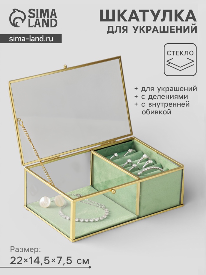 Шкатулка для украшений «Зелёная», 2 отделения, стекло с металлическим каркасом, 22×14.5×7.5